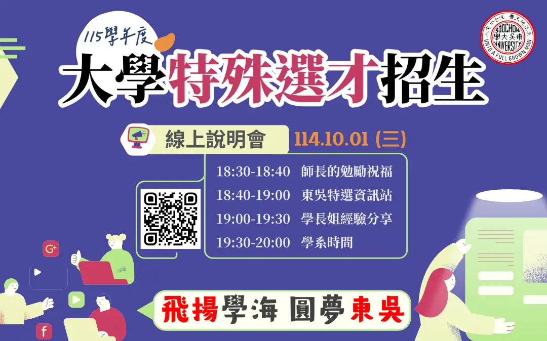 【校級活動】「東吳大學115學年度大學特殊選才招生線上說明會」(會議室連結與活動事項)